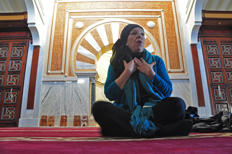 A convert shares her views with visitors to the mosque